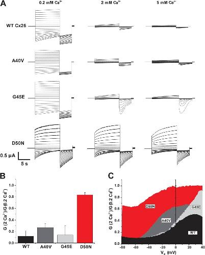Figure 1. The D50N KID mutation exhibits substantially impaired regulation by extracellular Ca2+ over a wide voltage range. (A) Representative hemichannel currents in Xenopus oocytes obtained using a voltage step protocol that consisted of 10-s steps, from 60 to â110 mV in intervals of 10 mV, followed by a 5-s step to â110 mV. Oocytes were voltage clamped to â20 mV between steps. Currents shown in each case are from single oocytes exposed to all three Ca2+ concentrations. WT Cx26, A40V, and G45E all showed substantial reductions in current magnitude at the higher Ca2+ concentrations, whereas D50N was nearly insensitive. (B) Bar graph showing ratios of the values of the macroscopic conductances measured in 2 and 0.2 mM Ca2+, G2Ca2+/G0.2Ca2+. The conductances were calculated from currents elicited by brief (1 s) voltage steps of ±10 and 20 mV from a holding potential of â20 mV. D50N exhibits near insensitivity to Ca2+. Each bar represents the mean ratio ± SE. n = 12 for WT Cx26, 8 for A40V, 12 for G45E, and 10 for D50N. (C) Plots showing mean ratios of macroscopic conductances measured in 2 and 0.2 mM Ca2+, G2Ca2+/G0.2Ca2+, over a voltage range of â80 to 40 mV. G-V curves were obtained from voltage ramps applied from 40 to â100 mV, 600 s in duration. Oocytes were held at a holding potential of â20 mV. Before initiating the ramps, oocytes were stepped to 40 mV for 30 s to allow conductance to reach steady-state. Ca2+ regulation shows some voltage dependence, with more effective inhibition of currents at large negative membrane potentials. D50N shows poor Ca2+ regulation over the entire voltage range. |