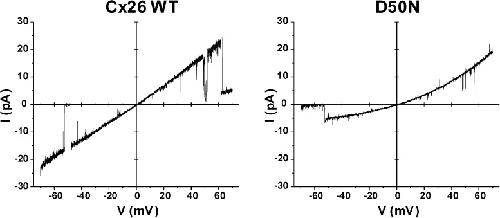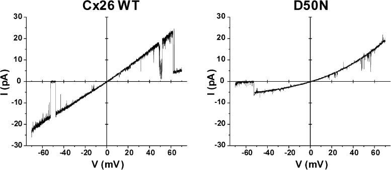 Figure 2. The D50N mutation substantially alters open-state conductance and rectification of Cx26 hemichannels. Representative examples of patch-clamp recordings from inside-out patches containing single WT Cx26 (left) and D50N (right) hemichannels are shown. Currents shown were obtained in response to 8-s voltage ramps applied between ±70 mV and leak subtracted (see Materials and methods). WT Cx26 shows slight outward rectification, whereas D50N exhibits a reduced slope conductance (measured at 0 mV) and strong outward rectification. Bath and pipette solutions consisted of IPS (see Materials and methods). |