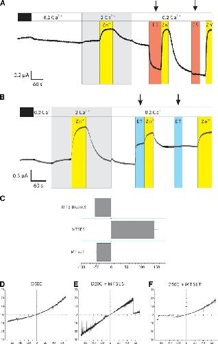Figure 3. SCAM experiments using MTS reagents indicate D50 is a pore-lining residue. (A and B) Shown are effects of MTSES (A) and MTSET (B) on macroscopic D50C hemichannel currents. Oocytes were held at â40 mV throughout. Oocytes were exposed to 100 mM NaCl salt solutions with Ca2+ concentrations as indicated in the top bar; black segments indicate oocytes were initially bathed in MND96. Because of the poor sensitivity to Ca2+, 200 µM Zn2+ (yellow segments) was used to periodically close D50C hemichannels. Application of 2 mM MTSES and 0.2 mM MTSET is indicated by arrows above the orange and blue segments, respectively. (C) Summary of the percent change in current (mean ± SE) after application of each reagent. n = 43 for MTSES, 18 for MTSET, and 4 for MTS-biotin X. (DâF) Representative examples of patch-clamp recordings obtained from cell-attached patches containing single D50C hemichannels recorded from oocytes that were not exposed to MTS reagents (D), were exposed to 2 mM MTSES (E), and were exposed to 0.2 mM MTSET (F). All unitary currents were obtained in response to 8-s voltage ramps between ±70 mV and leak subtracted. Bath and pipette solutions consisted of IPS. |