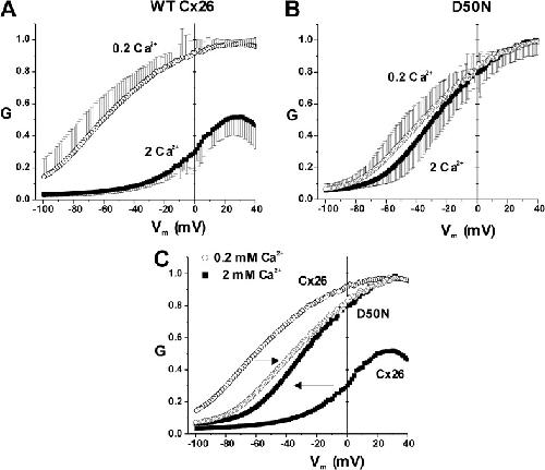 Figure 4. Loop gating remains strong in D50N, but activation is shifted compared with WT Cx26. (A and B) Shown are normalized G-V relationships of WT Cx26 (A) and D50N (B) hemichannels expressed in Xenopus oocytes at two different external Ca2+ concentrations, 0.2 and 2 mM. Data were obtained by applying slow (600 s) voltage ramps from 40 to −100 mV from a holding potential of −20 mV. Ramps were obtained for each oocyte in 0.2 and 2 mM Ca2+ and normalized to the maximum value measured in 0.2 mM Ca2+. In WT Cx26, increasing Ca2+ shifted activation in the depolarizing direction and suppressed current magnitude. D50N was nearly insensitive to Ca2+. Each symbol represents the mean value. n = 11 for WT Cx26 and 7 for D50N. For clarity, only error bars for +SE are shown for 0.2 mM Ca2+ and −SE for 2 mM Ca2+. (C) Superimposition of G-V curves for WT and D50N with error bars omitted for clarity. Compared with WT Cx26, activation of D50N is shifted positive in low Ca2+ (0.2 mM) conditions and negative in high Ca2+ conditions (2 mM). Data are the same as in A and B. |
