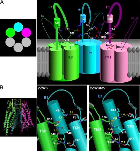 Figure 7. Possible intra- and intersubunit interactions at the border of TM1 and E1 of Cx26. (A) Illustration depicting three of six connexin subunits around a central aqueous pore. Each subunit is represented by a different color. Cylinders inside the subunits represent the transmembrane domains. TM1 denotes the first transmembrane domain that is exposed to the pore. E1 and E2 denote the first and second extracellular loop domains, respectively. D50 and D46 residues in E1 of each subunit are shown projecting into the pore. For the green (left) and cyan (middle) subunits, the D50 side chains come into proximity with K61 (situated on a short helix in E1) and Q48 (in E1) from the adjacent subunits. D46 also comes into close proximity to Q48. The illustration is not drawn to scale or strictly according to the atomic structure to emphasize the arrangement of interacting residues at the extracellular end of the pore. (B) Representation of the same three connexin subunits that constitute a Cx26 hemichannel viewed from the pore using the atomic structure published by Maeda et al. (2009). The superimposed cone in the left panel depicts the gross shape of the pore. The boxed region is shown in two expanded views to highlight the interacting residues between the green and cyan subunits. Only segments A39-R75 and C180-E187 are displayed in the expanded views for clarity. In the originally published structure (Protein Data Bank accession no. 2ZW3; middle), K61 in the cyan subunit is shown in close proximity to the backbone carbonyl of F51 in the same subunit. D50 and Q46 in the green subunit are in close proximity to Q48 from the adjacent (cyan) subunit. Other putative interactions shown are D46 with R184 in the same (green) subunit and R184 with D47 of next adjacent (cyan) subunit. Segments of E1 and TM1 are indicated. In the alternative structure (2ZW3rev; right) K61 in the cyan subunit is positioned in closer proximity to D50 in the adjacent (green) subunit. Structures were generated using PyMOL software. |