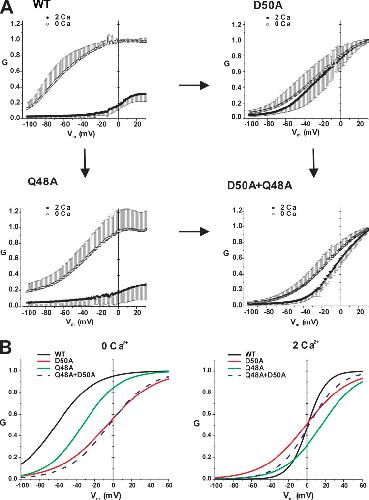 Figure 9. Mutant cycle analysis suggests that D50 and Q48 residues interact. (A) G-V relationships for WT Cx26, D50A, Q48A, and double mutant D50A + Q48A hemichannels at two different external Ca2+ concentrations, 0 (or nominal) and 2 mM. Data were obtained by applying slow (600 s) voltage ramps from 40 to −100 mV from a holding potential of −20 mV. For each oocyte, conductances at both Ca2+ concentrations were normalized to the maximum value in 0 mM Ca2+. n = 11 for WT Cx26, 17 for D50A, 14 for Q48A, and 6 for D50A + Q48A. The G-V curves are arranged as a mutant cycle where residues D50 and Q48 are mutated separately and together. The arrows connecting each pair of hemichannel phenotypes refer to mutation of either the D50 residue (horizontal arrows) or the Q48 residue (vertical arrows). The double D50A + Q48A mutant resembles D50A alone, suggestive of an interaction between D50 and Q48. (B) Fitted G-Vm relations normalized to their maximum conductance obtained by fitting data to a stochastic gating model developed for connexin channels (Paulauskas et al., 2009, 2012; see Materials and methods). These G-V curves represent voltage-dependent gating independent of rectification of open hemichannels. G-V curves for WT and mutant hemichannels are superimposed in 0 mM Ca2+ (left) and 2 mM Ca2+. Note the similarity of phenotypes displayed by D50A and double mutant D50A + Q48A in 0 and 2 mM Ca2+. |