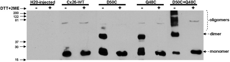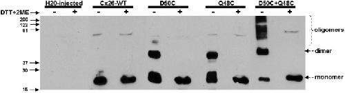Figure 11. Q48C and D50C can form disulfide bonds between adjacent subunits. Western blots generated from samples of unpaired oocytes injected with mRNA for WT Cx26, D50C, Q48C, and D50C + Q48C. Samples were run in nonreducing (−) and reducing conditions (+) in which DTT and ME were added. Single Cys substitutions (D50C and Q48C) presented monomers and dimers; the latter was sensitive to reducing agents. However, double Cys mutant (D50C + Q48C) presented multimers, also sensitive to reducing agents, consistent with disulfide bond formation between multiple subunits. Molecular mass is indicated in kilodaltons. |
