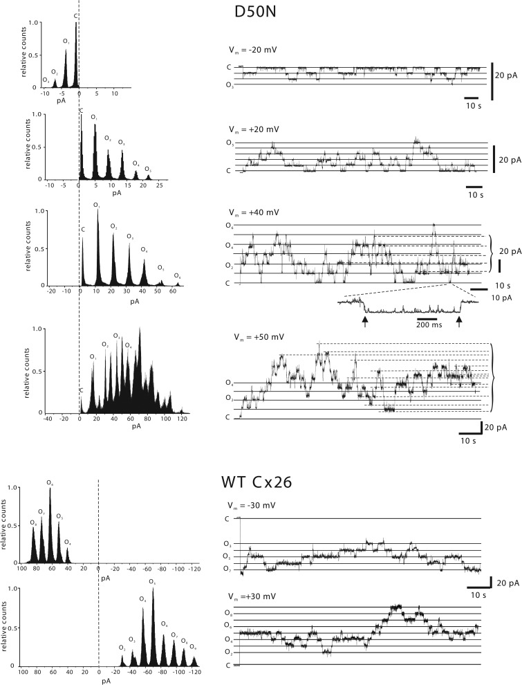 Figure 5. Single hemichannel recordings demonstrate that D50N affects loop gating. Multichannel cell-attached patch recordings of D50N and Cx26 WT hemichannels are shown. The patch pipette and bath solutions consisted of IPS. For the D50N, shown are 2–3-min consecutive segments of current recorded at membrane potentials of −20, 20, 40, and 50 mV. The solid lines designated C represent the leak conductance of the patch when no hemichannels were open. Solid lines designated On represent current levels of single or multiple fully open hemichannels. Dashed lines represent intermediate conductances (substates). All point histograms obtained from these recordings are shown to the left of each trace. At voltages of −20, 20, and 40 mV, gating events are uniform in size and represent transitions between closed and fully open hemichannels. The inset below the 40 mV trace shows an open and closing transition at an expanded time scale that is characteristic of loop gating. At 50 mV, many subconducting transitions become evident and are consistent with the onset of Vj or fast gating. Note that D50N hemichannels exhibit substantial closure even at −20 mV as expected because of the shift in loop gating caused by the mutation. For the Cx26 WT hemichannel, the currents shown were recorded at −30 mV and 30 mV. Note that open probability for WT Cx26 is similar at both voltages. All currents were filtered at 1 kHz, and data were acquired at 5 kHz. |