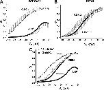 Figure 10. Effects of DTT on Cys-substituted hemichannels. (A) Representative records of membrane currents in oocytes voltage clamped at â40 mV. Voltage was occasionally stepped to 40 mV for 10 s to test for hemichannel activation. Application of 1 mM DTT (yellow) produced a large increase in current in oocytes expressing Q48C and the double mutant D50C + Q48C (bottom two panels). The effect of DTT was readily reversible after wash-out only for Q48C. DTT had essentially no effect on WT and D50C hemichannels (top two panels). (B) Bar graph summarizing the effects of DTT on WT Cx26, D50C, Q48C, and Q48C + D50C (C-C). Ala substitution at Q48 is also included. For each oocyte, current magnitude was measured at â40 and 40 mV before and after DTT. Data are plotted as fold increase in current after DTT. n = 13 for WT Cx26, 11 for D50C, 14 for Q48C, 7 for Q48A, and 7 for D50C + Q48C. Error bars represent mean ± SE. |