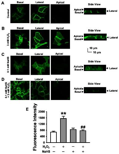 Figure 3. H2S inhibits H2O2-induced elevation of PI(3,4,5)P3 near the apical compartment of A6 cells.Left images show confocal microscopy XY sections of apical, lateral, and basal membranes of A6 cells as indicated. Right images show XZ sections of A6 cells. (A) Control; (B) the cells were treated with 3 mM H2O2 for 30 min; (C) the cells were treated with 0.1 mM NaHS for 30 min; (D) the cells were co-treated with 3 mM H2O2+0.1 mM NaHS for 30 min. (E) Summarized mean fluorescent intensities measured in and in the vicinity of the apical membrane from three independent experiments, which represent the levels of PI(3,4,5)P3 near the apical region of the membrane. **P<0.01 compared with control group, ##P<0.01 compared with H2O2 treatment group.