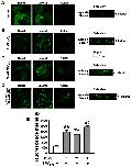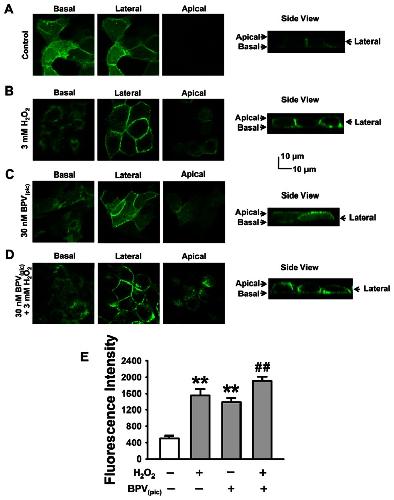 Figure 5. Inhibition of PTEN by BPV(pic) results in accumulation of PI(3,4,5)P3 near the apical compartment of A6 cells.The experiments were performed under different conditions as follows: (A) control; (B) the cells were treated with 3 mM H2O2 for 30 min; (C) the cells were treated with 30 nM BPV(pic) for 30 min; (D) the cells were co-treated with 30 nM BPV(pic) +3 mM for 30 min. (E) Summarized mean fluorescent intensities measured as ascribed in Figure 3 from three independent experiments, which represent the level of PI(3,4,5)P3 in the apical membrane. **P<0.01 compared with control group, ##P<0.01 compared with BPV(pic) treatment group.