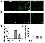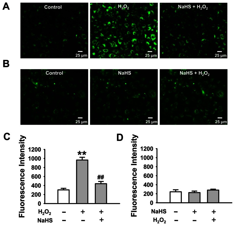 Figure 2. H2S ameliorates H2O2-elicited oxidative stress in A6 cells.All experiments were assessed in the presence of 50 µM 2,2′-dipyridyl. The images represent the level of intracellular ROS detected by the membrane-permeable fluorescent probe, carboxy-H2DCFDA, under indicated conditions in A6 cells. (A) The left image shows that there was a certain residual level of intracellular ROS under control condition; middle image shows a significant elevation of intracellular ROS level upon application of 3 mM H2O2; right image shows that this H2O2-induced increase in intracellular ROS was abolished by additional 0.1 mM NaHS. (B) The images represent that the intracellular ROS levels under control (left), treatment of A6 cells with 0.1 mM NaHS for 30 min (middle) followed by additional 0.1 mM H2O2 for 30 min (right). (C) and (D) Summarized fluorescent intensity of (A) and (B), respectively. Data were from three independent paired experiments. **P<0.01 compared with control group, ##P<0.01 compared with H2O2 treatment group.