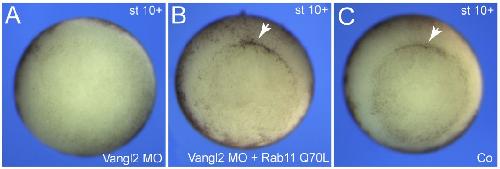 Fig. S4. Rescue of dorsal blastopore in Vangl2-depleted embryos by Rab11 RNA. (A, B) Embryos were injected with 30 ng of Vangl2 MO and 1 ng of Rab11Q70L RNA as indicated. (C) Uninjected control embryo. Vegetal views reveal the comparative morphology of the dorsal lip (arrow) for representative embryos from data in Fig. 6I. |