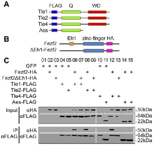 Fig. 4. Fezf2 functions through interaction with members of Groucho family. (A) Tle1, Tle2, Tle4 and Aes constructs. Note that Aes lacks the protein-interaction WD domain. (B) Wild-type Fezf2 and δEh1-Fezf2 with a mutated Eh1 domain. (C) Immunoprecipitation of extracts from Xenopus embryos injected with different combinations of the indicated mRNAs, showing that Fezf2 interacts with Tle1, Tle2 and Tle4 (lanes 6, 8 and 12) but not Aes (lanes 14, 15). The Eh1 domain is required for the proper interaction between Fezf2 and Tle1/2/4 (lanes 6 and 7, 8 and 9, 12 and 13). |