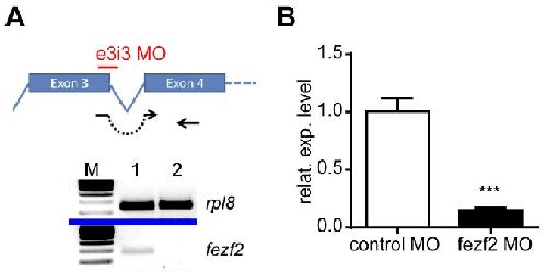Figure S3. (A) Schematic of fezf2 MO design and knockdown efficiency. The MO targets the exon3-intron3 junction (above) and semi-quantitative PCR analysis shows mature fezf2 mRNA levels in stage 24 embryos (below), injected with control MO (1) or fezf2 MO (2). Black arrow pair indicates the position of validation primers for RTPCR analysis, the forward primer overlaps the exon3-exon4 junction. (B) qPCR results, n=3 replicates. In both cases, the ribosomal protein L8 (rpl8) gene was used as an internal control. |