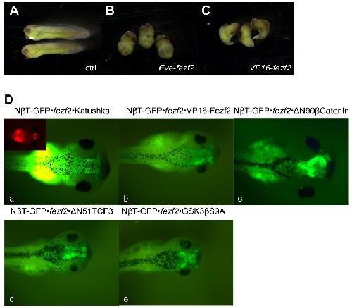 Figure S6 (related to Figure 3). fezf2-regulated endogenous level of Wnt/β-catenin signalling governs forebrain neurogenesis in transgenic embryos. (A-C) Phenotypic effect of antimorphic Fezf2. (A) nuclear β-gal (control) mRNA, (B) fezf2 mRNA, showing strongly dorsal-anteriorized (DAI 8-9) embryos. (C) VP16-fezf2 mRNA, showing strongly ventralised (DAI 1-2) embryos. (D) GFP expression in the forebrain of embryos from different transgenic lines at day 7, top view. (a) NβTGFP ·fezf2·Katushka. Green: GFP; red: Katushka (inset). (b) NβT-GFP·fezf2·VP16- Fezf2. (c) NβT-GFP·fezf2· N90βcatenin. (d) NβT-GFP·fezf2· N51Tcf3. (e) NβTGFP ·fezf2·GSK3βS9A. |