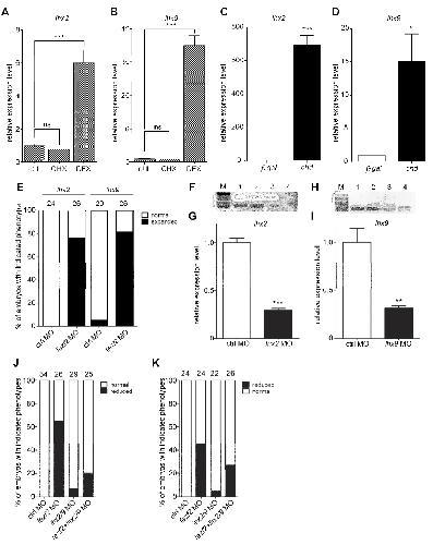 Figure S8 (related to Figure 6). Fezf2 represses the activities of lhx2 and lhx9. (A-B) Control experiments showing the expression of lhx2 and lhx9 in stage 12 animal cap explants injected with p3hGR-VP16-Fezf2, either left untreated, or treated with either CHX or DEX alone. qPCR results of (A) lhx2 and (B) lhx9 are shown (n=3 replicates, P<0.001). rpl8 was used as an internal control. (C-D) Stage 20 animal cap explants neuralised by chordin mRNA expressed high level of lhx2 and lhx9. qPCR results of (C) lhx2 and (D) lhx9 are shown (n=3 replicates, P<0.001 and P<0.05). rpl8 was used as an internal control. (E) Bar graph of the quantification and statistics of phenotypes from control or fezf2 morphant groups regarding the expression of lhx2 and lhx9. (F-G) Validation of lhx2 i2e3 MO. (F) Validation by RT-PCR. M: marker. Lane 1-2: rpl8; 1: control MO; 2: lhx2 MO. Lane 3-4: lhx2; Lane 3: control MO, Lane 4: lhx2 MO. (G) Validation by qPCR. rpl8 was used as an internal control in both cases. n=3 replicates, P<0.001. (H-I) Validation of lhx9 e1i1 MO. (H) Validation by RT-PCR. M: marker. Lane 1-2: rpl8; 1: control MO; 2: lhx9 MO. Lane 3-4: lhx9; Lane 3: control MO, Lane 4: lhx9 MO. (I) Validation by qPCR. rpl8 was used as an internal control in both cases. n=3 replicates, P<0.01. (J) Bar graph of the quantification and statistics of phenotypes from different morphant groups regarding arx expression. (K) Bar graph of the quantification and statistics of phenotypes from different morphant groups regarding ngn1 expression. In all bar graphs, numbers above each bar represent counts of embryos examined in each group. Error bars represent ±s. e. m. |