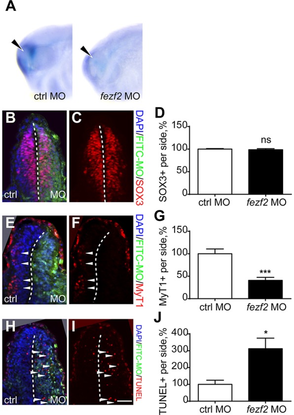 Fig. 1. fezf2 knockdown leads to defects in forebrain neuronal differentiation. (A) Whole-mount in situ hybridisation for arx in control MO (20/20) or fezf2 MO (15/18) injected Xenopus embryos. Arrowhead indicates the forebrain. (B-J) One blastomere at the 2-cell stage was injected with fezf2 MO and embryos were sectioned at stage 30 transversely across the forebrain, and stained for Sox3 (B,C), MyT1 (E,F) or TUNEL (H,I). FITC staining identifies the injected side (B,E,H). Arrowheads indicate MyT1+ (E,F) or TUNEL+ (H,I) cells. (D,G,J) Statistical analysis of Sox3+ (n=4 embryos), MyT1+ (n=6 embryos) and TUNEL+ (n=4 embryos) cells. All control sides have been normalised to 100%. Error bars represent s.e.m. *P<0.05; ***P<0.001; ns, not significant. Scale bar: 25â µm. |