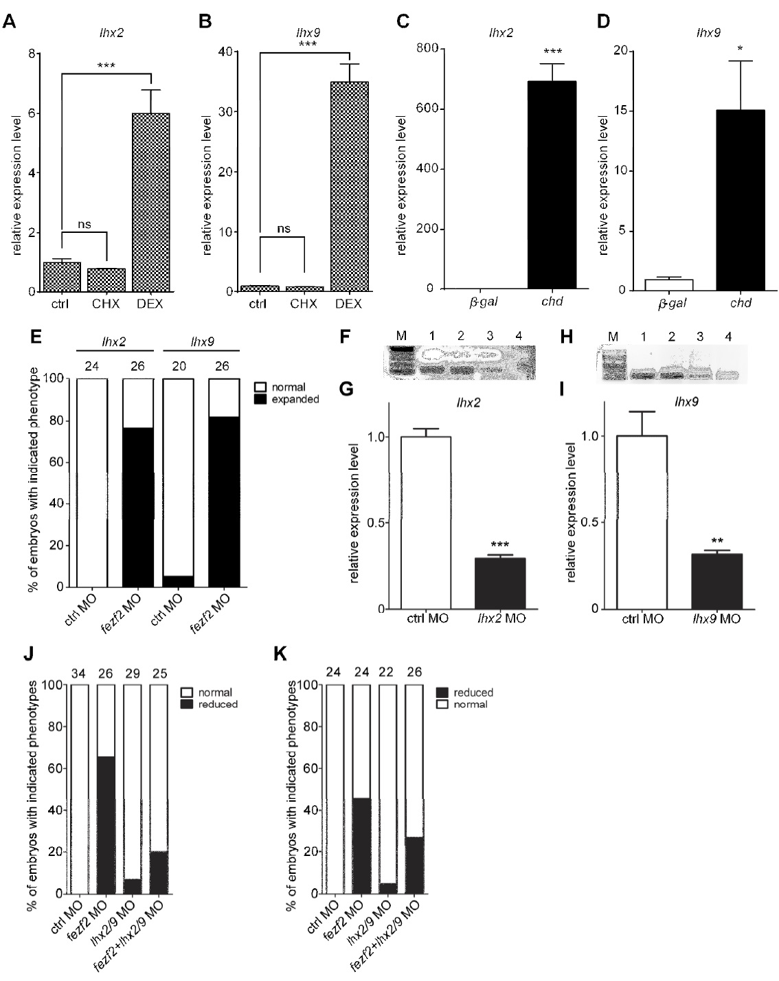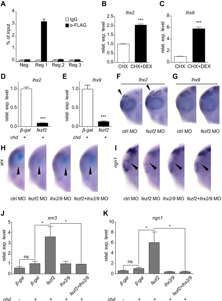 Fig. 5. Fezf2 represses the activity of lhx2 and lhx9 in the forebrain. (A) ChIP-qPCR analysis of Fezf2 binding to the lhx2 promoter. Region 1 showed very high enrichment (n=3 replicates). (B,C) qPCR analysis of lhx2 and lhx9 expression in p3hGR-VP16-Fezf2-injected animal cap explants aged to stage 12 and treated with CHX alone or CHX+DEX (n=3 replicates). (D,E) qPCR analysis of lhx2 and lhx9 expression in neuralised animal cap explants aged to stage 20 (n=3 replicates). (F,G) In situ hybridisation analysis shows that mild knockdown of fezf2 leads to expansion of the lhx2 (F) and lhx9 (G) expression area. Arrowhead indicates the epithalamus; bracket indicates the ventral diencephalon. (H,I) In situ hybridisation analysis of arx (H) or ngn1 (I) in stage 28 morphants (lateral views). Arrowheads indicate arx or ngn1 expression. (J) qPCR analysis shows that lhx2 and lhx9 antagonise expression of the fezf2-induced Wnt-responsive gene xnr3 in stage 14 animal cap explants (n=3 replicates). (K) qPCR analysis shows lhx2 and lhx9 antagonise fezf2-induced ngn1 expression in stage 20 animal cap explants (n=3 replicates). In all qPCR analyses, rpl8 was used as internal control. Error bars represent s.e.m. *P<0.05, ***P<0.001; ns, not significant. |