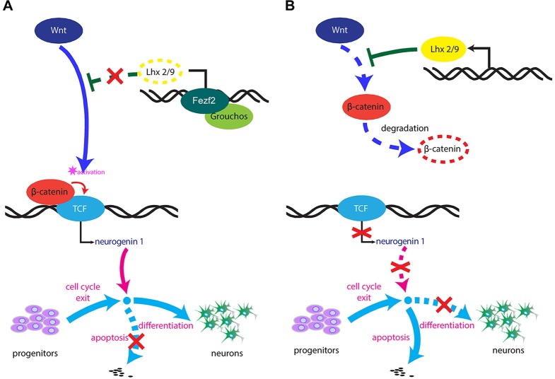 Fig. 6. Mechanistic model of Fezf2 function in the forebrain. (A) In the presence of Fezf2. Fezf2 interacts with Groucho-family repressors and inhibits the expression of lhx2/lhx9. Consequently, β-catenin binds to the Tcf complex and Wnt signalling is activated, promoting the expression of neurogenin 1 and thus stimulating neuronal differentiation. (B) In the absence of Fezf2. Lhx2/Lhx9 inhibits Wnt signalling, resulting in the degradation of β-catenin. In the absence of β-catenin, the Tcf complex is maintained in a repressive state. This repressive Tcf complex inhibits neurogenin 1 expression, thus inhibiting neurogenesis. Progenitor cells that have exited the proliferation state cannot differentiate and thus enter apoptosis. |
