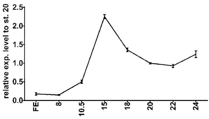 Figure S1. Temporal expression pattern of X. tropicalis fezf2 revealed by qPCR analysis at different stages, including fertilised egg (FE), blastula (stage 8), gastrula (stage 10.5), neurula (stage 15-20), and tailbud (stage 22-24) (n=3 replicates). Error bars represent ±s. e. m. |