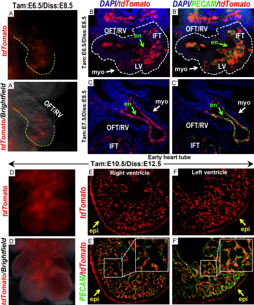 Planar cell polarity (PCP) signaling is an evolutionarily conserved mechanism that coordinates polarized cell behavior to regulate tissue morphogenesis during vertebrate gastrulation, neurulation and organogenesis. In Xenopus and zebrafish, PCP signaling is activated by non-canonical Wnts such as Wnt11, and detailed understanding of Wnt11 expression has provided important clues on when, where and how PCP may be activated to regulate tissue morphogenesis. To explore the role of Wnt11 in mammalian development, we established a Wnt11 expression and lineage map with high spatial and temporal resolution by creating and analyzing a tamoxifen-inducible Wnt11-CreER BAC (bacterial artificial chromosome) transgenic mouse line. Our short- and long-term lineage tracing experiments indicated that Wnt11-CreER could faithfully recapitulate endogenous Wnt11 expression, and revealed for the first time that cells transiently expressing Wnt11 at early gastrulation were fated to become specifically the progenitors of the entire endoderm. During mid-gastrulation, Wnt11-CreER expressing cells also contribute extensively to the endothelium in both embryonic and extraembryonic compartments, and the endocardium in all chambers of the developing heart. In contrast, Wnt11-CreER expression in the myocardium starts from late-gastrulation, and occurs in three transient, sequential waves: first in the precursors of the left ventricular (LV) myocardium from E7.0 to 8.0; subsequently in the right ventricular (RV) myocardium from E8.0 to 9.0; and finally in the superior wall of the outflow tract (OFT) myocardium from E8.5 to 10.5. These results provide formal genetic proof that the majority of the endocardium and myocardium diverge by mid-gastrulation in the mouse, and suggest a tight spatial and temporal control of Wnt11 expression in the myocardial lineage to coordinate with myocardial differentiation in the first and second heart field progenitors to form the LV, RV and OFT. The insights gained from this study will also guide future investigations to decipher the role of non-canonical Wnt/PCP signaling in endoderm development, vasculogenesis and heart formation.