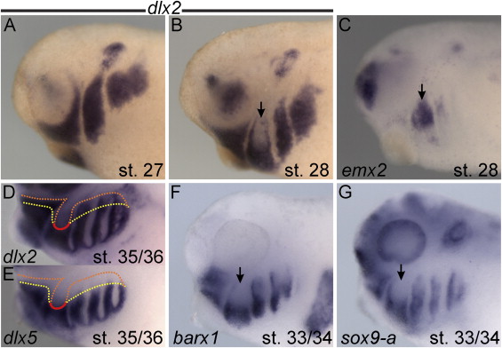Fig. 5. Unique gene expression in the X. laevis PA2. All larvae are shown in lateral view with anterior to left. (A and B) dlx2 is expressed throughout migratory PA CNCCs at (A) st. 27, but at (B) st. 28 it becomes sharply downregulated in the dorsal PA2 (the future columella; arrow in B). (C) Coinciding with dlx2 down-regulation, emx2 is expressed at st. 28 in the dorsal PA2 (arrow). At st. 35/36, (D) dlx2 and (E) dlx5 uniquely share part of their dorsal boundary in PA2. Orange and yellow dotted lines show the boundary of dlx2 and dlx5, respectively, while the red solid line indicates their shared border. (F) barx1, and (G) sox9-a also display conspicuous down-regulation in the dorsal PA2 at st. 33/34 (arrows in F and G). |