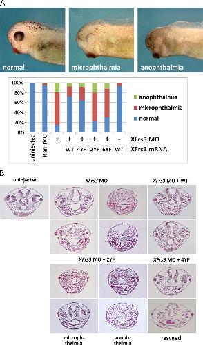 Fig. 7. The putative Shp2-binding sites, but not the putative Grb2-binding sites, are important for XFrs3 function during eye development. Indicated combinations of XFrs3 MO or random (Ran.) MO (7.5 pmole each/embryo) along with wild type (WT) or mutant (4YF, 2YF, or 6YF) XFrs3 mRNA (50 pg each/embryo) were injected into equatorial region of 2-cell embryos. (A) Embryos are scored for phenotypes at stage 38. The percentages of embryos with microphthalmia or anophthalmia are tabulated in the bottom panel. Injections were carried out with 3 separate batches of embryos. (B) Embryos, scored for particular phenotypes in panel A, were sectioned at the level of eyes and stained with hematoxylin/eosin. |