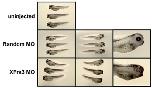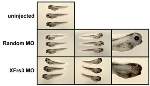 Supplement Fig. 7. XFrs3 MO inhibits eye development. XFrs3 or control random MO (7.5 pmole each/embryo) was injected into one dorsal blastomere at 4-cell stage, and the embryos are photographed at stage 40. The left most row shows uninjected side and the second row shows the injected side. The third row shows the injected side of representative embryo at higher magnification. |