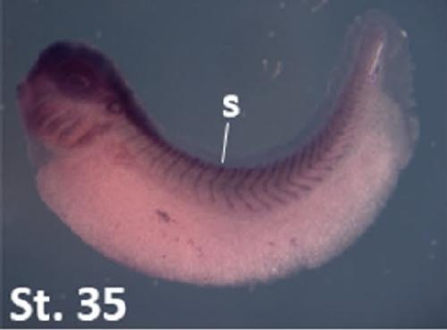frs3 (fibroblast growth factor receptor substrate 3) gene expression in Xenopus laevis embryo, assayed via in situ hybridization, NF stage 35, lateral view, anterior left, dorsal up. |