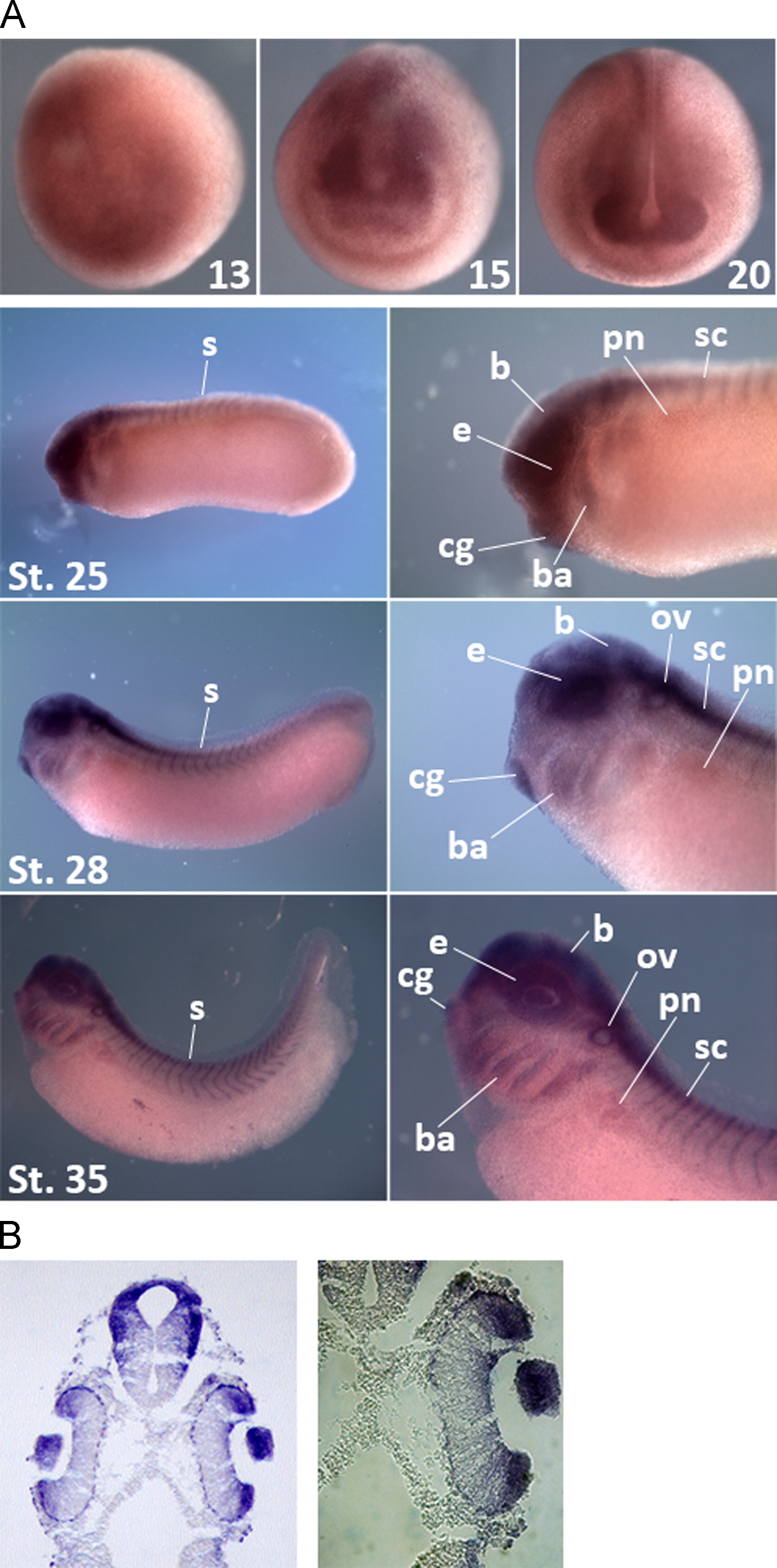 Fig. 2. Spatial expression patterns of XFrs3. (A) Whole-mount in situ hybridization of XFrs3. Embryos at indicated stages (13, 15, 20, 25, 28 and 35) were subjected to in situ hybridization with XFrs3 antisense probe. For stages 25, 28 and 35, right panels show magnified images of embryos at left panels. At early neurula stage (stage 13), XFrs3 is expressed broadly in the presumptive anterior neuroectoderm, and its expression is gradually localized to the eye field, cement gland and neural tube at mid-neurula and late neurula stages (stages 15 and 20). At early tailbud stages (stages 25 and 28) and tadpole stage (stage 35), XFrs3 transcript is localized in anterior structures of neuroectodermal origin [branchial arches (ba), cement gland (cg), eyes (e) and otic vesicles (ov)], brain (b), spinal cord (sc), somites (s) and pronephros (pn). (B) XFrs3 expression pattern in the eye at stage 35. Embryos at stages 35 were subjected to whole-mount in situ hybridization with XFrs3 antisense probe and then cross-sectioned. XFrs3 is expressed in the lens, the retina, and the brain. |