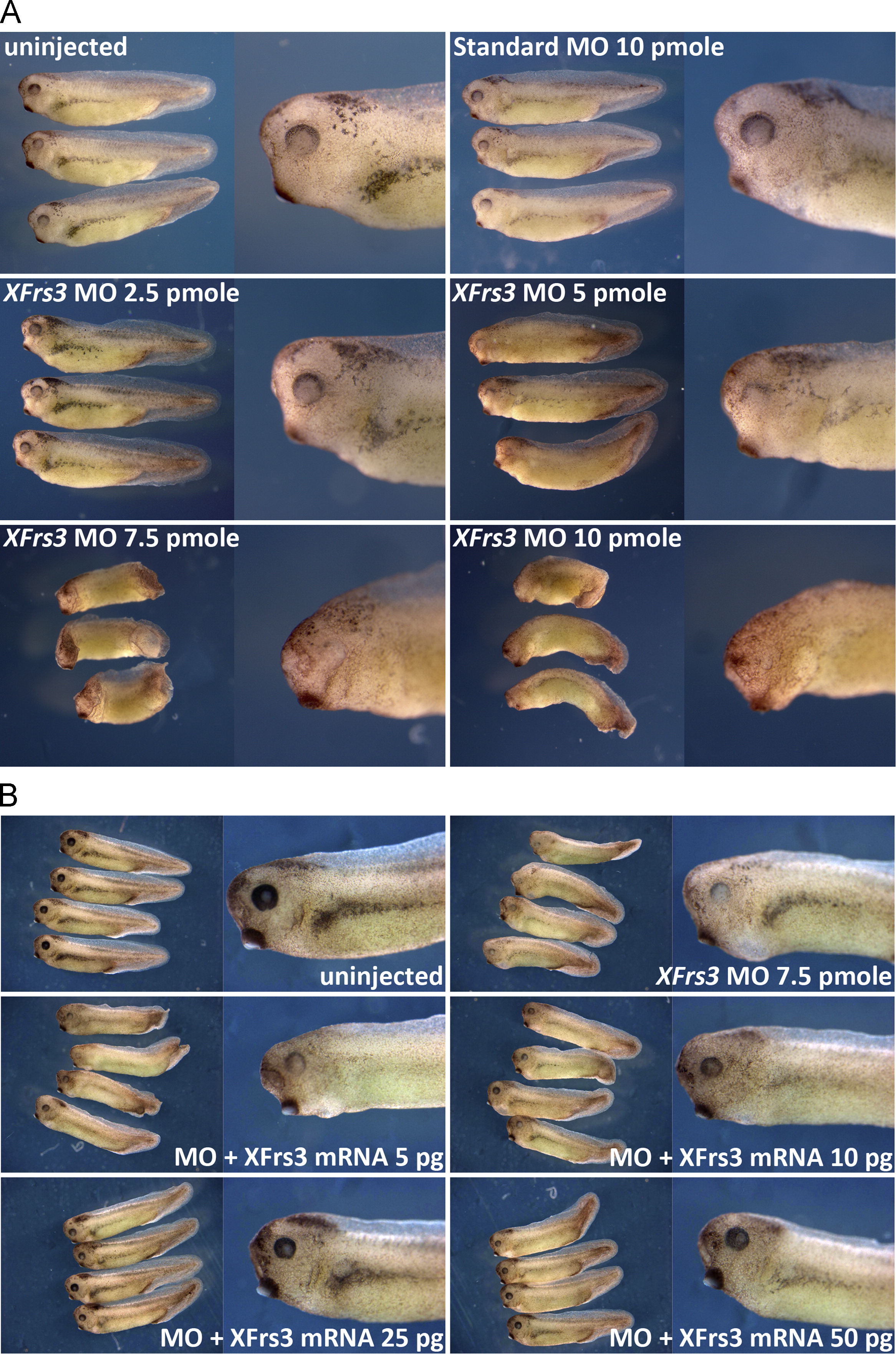Fig. 4. Knockdown of XFrs3 causes defects in the eye and anterior structures. (A) Indicated amounts (per embryo) of XFrs3 MO or standard negative control MO were injected into equatorial region of 2-cell embryos, and the embryos are scored for phenotypes at stage 33/34. Representative embryos are also photographed at higher magnification to show defects in the eye. (B) Indicated combinations of XFrs3 MO (MO, 7.5 pmole/embryo) and XFrs3 mRNA (5â50 pg/embryo) were injected into equatorial region of 2-cell embryos, and the embryos are scored for phenotypes at stage 38. |