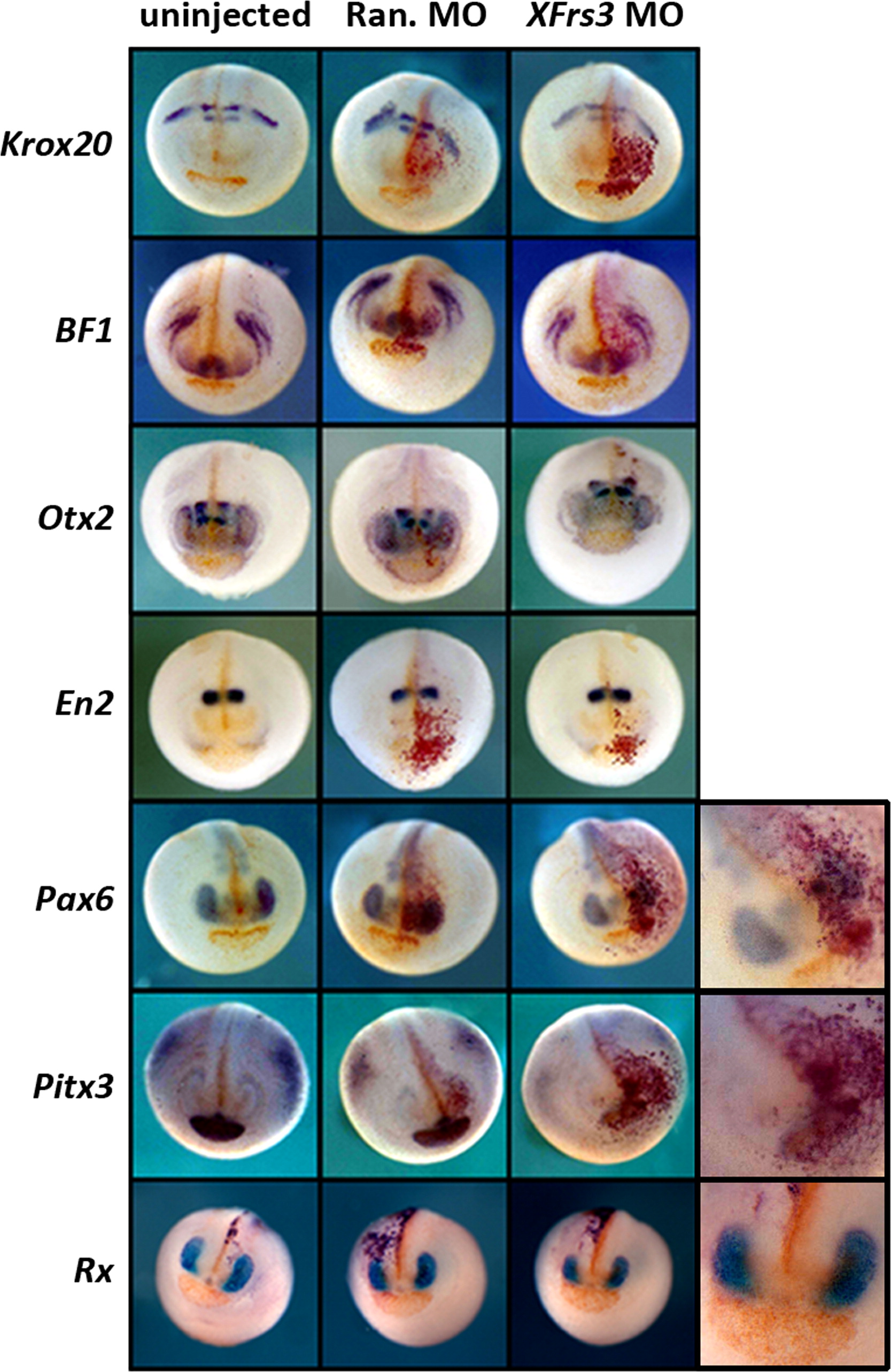Fig. 5. Knockdown of XFrs3 reduces the expression of eye-specific marker Pax6 but not Rx at late neurula stage. XFrs3 MO or random negative control (Ran.) MO (7.5 pmole each/embryo) was injected along with nuclear β-galactosidase mRNA (250 pg/embryo) into one dorsal blastomere of 4-cell embryos. Embryos were fixed at stage 20, stained for β-galactosidase (red), and then subjected to whole-mount in situ hybridization with indicated antisense RNA probe. Embryos are viewed from anterior with dorsal sides towards the top. The right most panels for Pax6, Pitx3, and Rx are magnified images of embryos on the left. Injections were carried out with 4 separate batches of embryos, and 2 batched of embryos were pooled and randomly chosen for in situ hybridization analyses. |