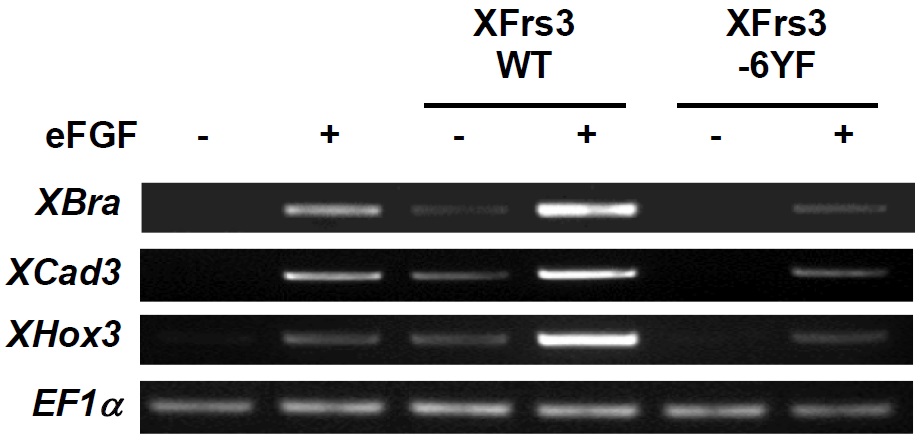 Supplement Fig. 3. XFrs3 induces and enhances FGF-induced expression of mesoderm markers. eFGF mRNA (20 pg/embryo) was injected along with indicated combinations of wild type or mutant XFrs3 mRNA (1 ng each/embryos) to animal region of 2-cell embryos. Animal cap cells were explanted at stage 8 and harvested at stage 10. The expression of mesoderm markers XBra, XCad3 and XHox3 is examined by RT-PCR. EF1alpha is used as a loading control. |