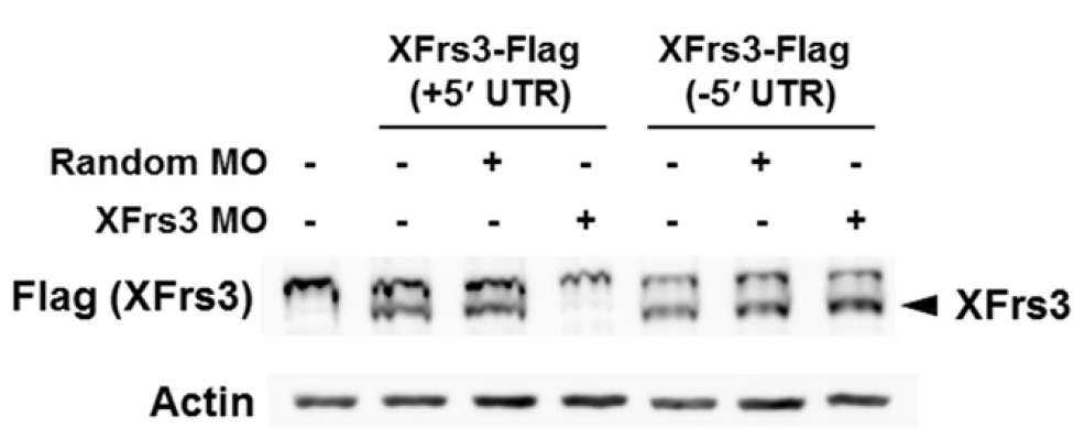 Supplement Fig. 6. Specificity of XFrs3 MO. 2-cell embryos were injected to equatorial region with indicated combinations of XFrs3-Flag mRNA with (+5' UTR) or without (-5' UTR) XFrs3 5' UTR (50 pg/embryo), and random or XFrs3 MO (7.5 pmole/embryo). Embryos were harvested at stage 10, and the expression levels of XFrs3-Flag are compared by anti-Flag immunoblotting [Flag (XFrs3)]. XFrs3 MO specifically inhibited the translation of XFrs3-Flag from mRNA containing the 5'UTR. Actin is used as a loading control. |