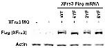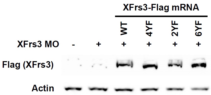 Supplement Fig. 9. Wild type and mutant XFrs3 mRNAs are translated with similar efficiencies. Indicated combinations of XFrs3 MO (7.5 pmole/embryo) and C-terminal Flagtagged XFrs3 mRNA (XFrs3-Flag, 50 pg each/embryo) were injected to equatorial region of 2-cell embryos. The levels of XFrs3-Flag proteins in stage 10 embryos are compared by anti- Flag immunoblotting [Flag (XFrs3)]. Actin is used as a loading control. |