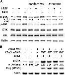 Fig. 8. XFrs3 is important for FGF or IGF-induced phosphorylation of ERK. Indicated combinations of XFrs3 or random MO (7.5 pmole each/embryo) along with wild type (WT) or mutant (4YF, 2YF, or 6YF) XFrs3 mRNA (50 pg each/embryo) were injected into animal region of 2-cell embryos. Animal caps were explanted at stage 8.5, treated with recombinant basic FGF (bFGF) (50 ng/mL) or IGFII (40 ng/mL) protein, and then harvested when sibling embryos reached stage 10. Activation of ERK (p-ERK) and Akt (p-Akt) are analyzed by immunoblotting. Actin is used as a loading control. For panel A, the total protein levels of ERK and Akt are also compared. For panel B, levels of XFrs3 proteins are compared by anti-Flag immunoblotting [Flag (XFrs3)]. (A) The numbers below p-ERK immunoblot (p-ERK/ERK) indicate relative intensities of p-ERK bands after normalization with corresponding ERK bands. The intensity of p-ERK band in MO non-injected and bFGF-treated sample is considered as 1. The intensities of p-ERK and ERK bands were measured by densitometry. (B) The numbers below p-ERK immunoblot (p-ERK/Actin) indicate relative intensities of p-ERK bands after normalization with corresponding Actin bands. The intensity of p-ERK band in MO/mRNA non-injected and bFGF-treated sample is considered as 1. |
