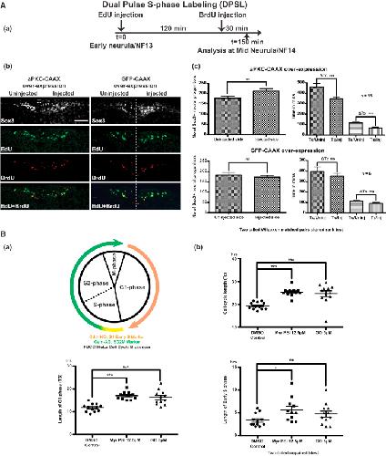 Figure 2. Overexpressing Activated aPKC Causes Progenitor Proliferation and Shortens the Cell Cycle by Shortening G1 and S Phases(A) DPSL analysis (a) shows that embryos on the aPKC-CAAX injected side show higher number of Sox3+ progenitors (b and c) and have shorter cell cycle (TC) and S phase (TS) (c, mean ± SEM). Control embryos overexpressing GFP-CAAX showed no such differences. The scale bar in (Ab) represents 100 μM. See also Figure S1.(B) Schematic of Fucci cell cycle biosensor, which can be visually used to measure the lengths of various phases of cell cycle, is shown (a). When live imaged in the presence of either a pseudosubstrate inhibitor (MyrPSI) or a chemical inhibitor (Gö6983/GO) against aPKC, HeLa Fucci cells showed a significant increase in cell-cycle length (TC) due to elongated G1 and early S phases (b, mean ± SEM). Time-lapse movies are shown in Movies S1AâS1C. |