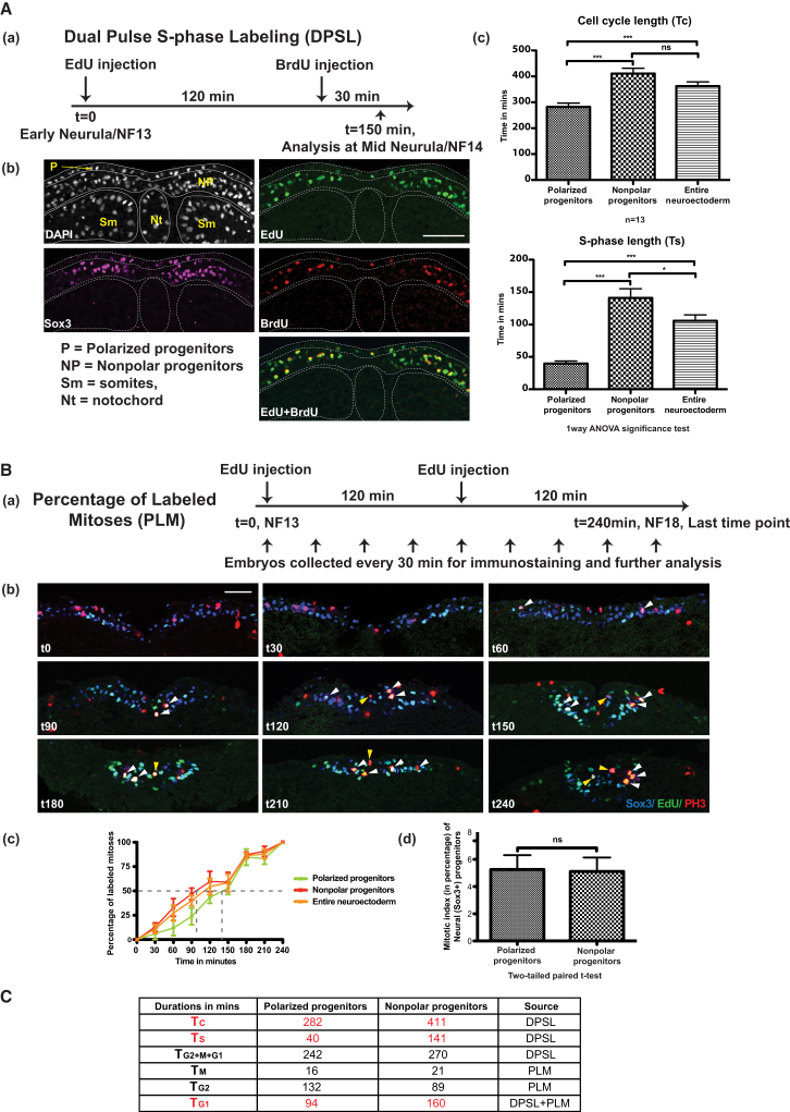 Figure 1. Polarized and Nonpolar Neural Progenitors Have Significantly Different Cell-Cycle Kinetics Parameters(A) Dual pulse S phase labeling (DPSL) technique applied on wild-type NF13 Xenopus embryos (a) and analyzed by sectioning (b) shows that outer polar progenitors have shorter cell cycle (TC) and S phase (TS) lengths than inner nonpolar progenitors (c, mean ± SEM).(B) Similar embryos were processed for percentage of labeled mitoses (PLM, to estimate TG2+1/2M) (a–c). Representative sections are shown in (b), in which white arrowheads show labeled mitoses for nonpolar progenitors, while yellow arrowheads show labeled mitoses for polarized progenitors. During the time course of the experiment, neural plate cells converge to the midline. Percentage of mitotic indices for polarized and nonpolar progenitors showed no differences (d, mean ± SEM).(C) Table summarizes different cell-cycle parameters for the two types of progenitors. See the Experimental Procedures and Supplemental Experimental Procedures for details about the techniques and calculations of kinetic parameters. All scale bars represent 100 μM. |