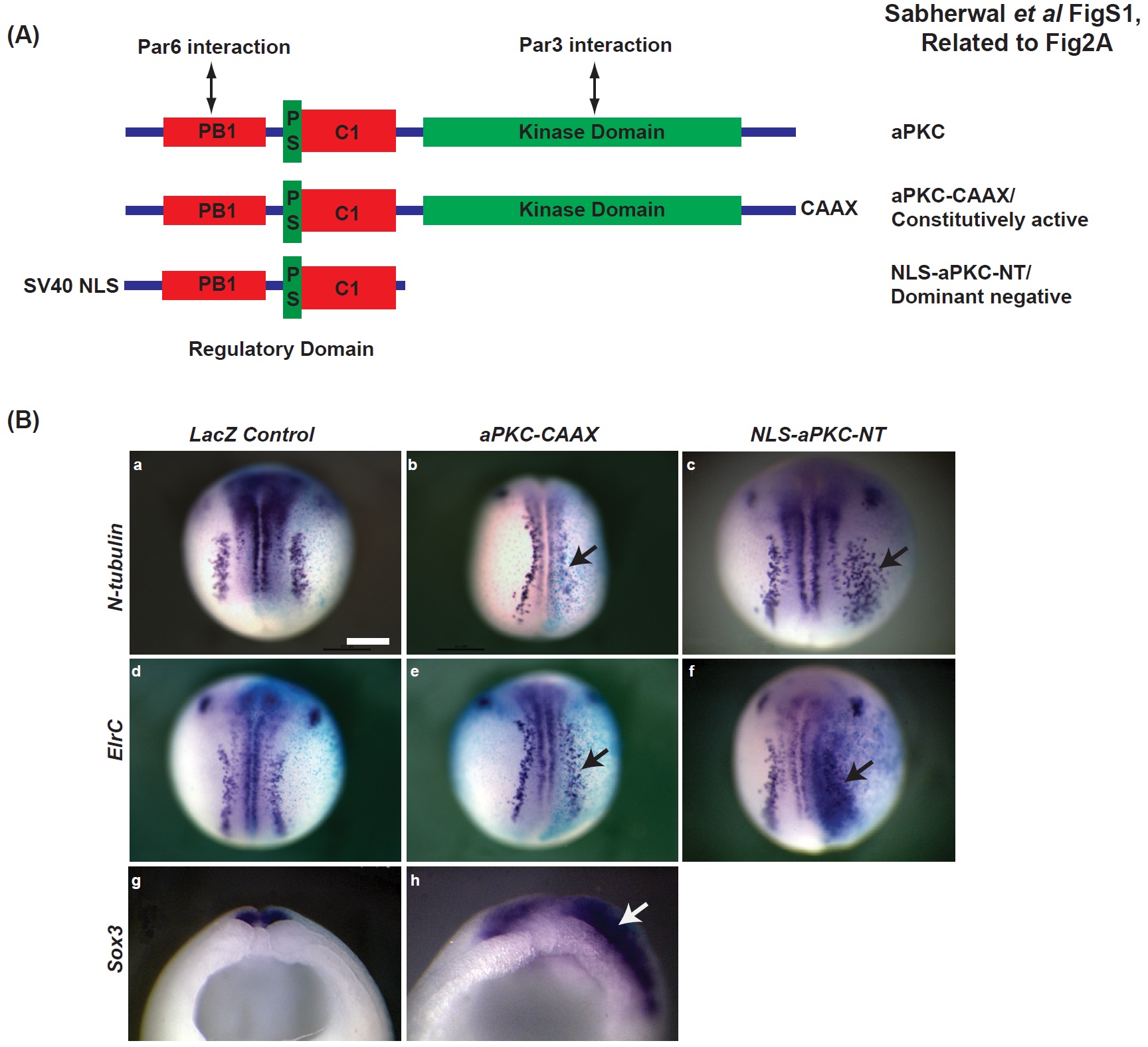 FigS1, related to fig2A: Over-expression of apicobasal polarity kinase aPKC promotes progenitor proliferation and suppresses neuronal differentiation. (A) shows wild type , constitutively active and dominant negative versions of aPKC with their important domains. PB1 domain (responsible for aPKCâs interaction with Par6), PS/pseudosubstrate domain and C1 domain (responsible for its interaction with membrane lipids) constitute aPKCâs N-terminal regulatory domain, while C terminal part of the protein constitutes its kinase domain. The schematic has been adapted from Suzuki et al, 2003, J. Biochem. 133, 9â16. Constitutively active and dominant negative forms of aPKC have been reported in our previous publication (Sabherwal et al, 2009). Overexpression of membrane targeted active aPKC (aPKC-CAAX) suppresses neuronal differentiation as differentiation markers N-tubulin and ElrC showed reduction on injected side of the embryos (Bb and Be), and promoted neural progenitor proliferation (Progenitor marker Sox3 was enhanced on injected side, Bh). Overexpressing nuclear dominant negative form of aPKC had the inverse effect of promoting differentiation (Bc and Bf). Scale bar in Ba represents 500μM. |