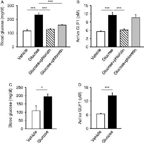 Figure 1. Physiological relevance of SGLT1, GLUT2, and KATP channel in glucose-induced GLP1 secretion in the early phase. Blood glucose (A) and plasma GLP1 concentrations (B) in portal vein at 5 min after intraduodenal administration of glucose (or vehicle) are shown. Glucose was co-administrated with or without phlorizin (500 mg/kg) or phloretin (500 mg/kg) to WT mice (A and B). Blood glucose (C) and plasma GLP1 concentrations (D) in portal vein of Kir6.2-deficient mice at 5 min after intraduodenal glucose administration are also shown. Data are expressed as mean±s.e.m. *P<0.05 and ***P<0.001.