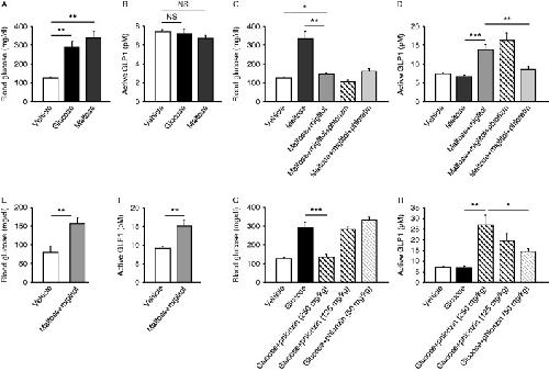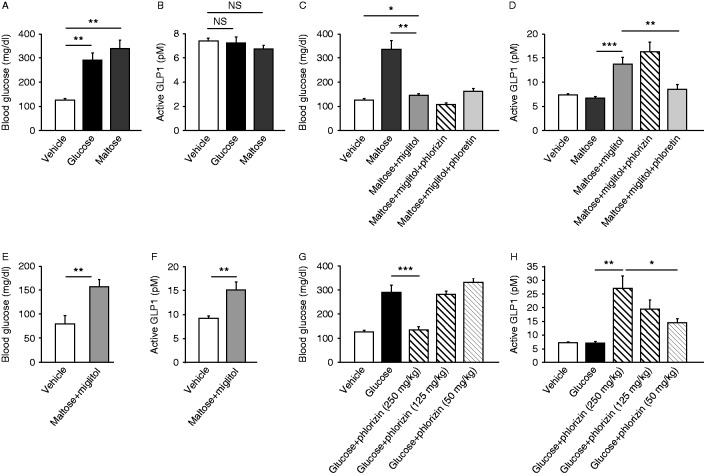 −/− mice at 30 min after oral administration of maltose plus miglitol are shown. Effect of different doses (250, 125, and 50 mg/kg) of phlorizin on glucose-induced GLP1 secretion is shown (G and H). Data are expressed as mean±s.e.m. *P<0.05, **P<0.01, and ***P<0.001.