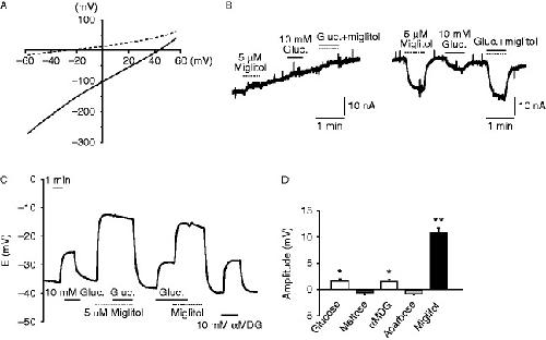 Figure 4. Electrophysiological recording of Xenopus laevis oocytes expressing hSGLT3. (A, B, C, and D) (A) I–V relationship of the oocytes expressing hSGLT3 in the presence (solid line) or absence (dashed line) of miglitol. (B) A representative recording of whole-cell current under voltage clamp mode in an oocyte expressing hSGLT3 in the absence (left) or presence (right) of Na+ in the buffer. ‘Gluc.’ denotes glucose. (C) A representative recording of the membrane potentials under current clamp mode in an oocyte expressing hSGLT3 in response to glucose and/or miglitol. The SGLT3 agonist α-methyl-d-glucopyranoside (αMDG) was used as a positive control for SGLT3-dependent depolarization. ‘Gluc.’ denotes glucose. (E) The current changes by several stimuli (n=4 for each). Data are expressed as mean±s.e.m. *P<0.05 and **P<0.01 (compared with the base line).