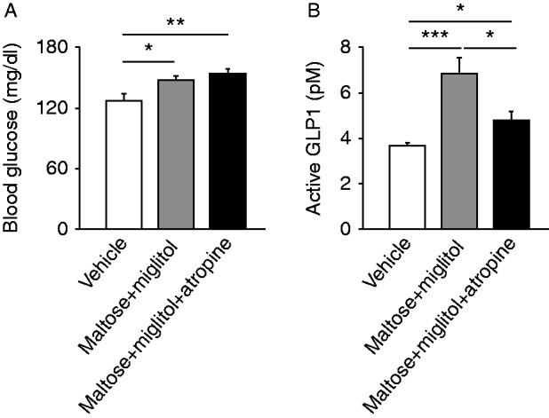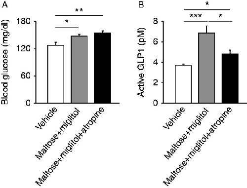 Figure 6. Involvement of parasympathetic nerves in GLP1 secretion. Blood glucose (A) and plasma GLP1 concentrations (B) in the portal vein at 30 min after oral administration of maltose plus miglitol with or without atropine pretreatment are shown. Data are expressed as mean±s.e.m. *P<0.05, **P<0.01, and ***P<0.001.