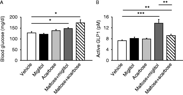 Figure 3. Comparison between miglitol and acarbose of GLP1 secretion induced by maltose. Blood glucose (A) and plasma GLP1 concentrations (B) in the portal vein at 30 min after oral administration of miglitol, acarbose, maltose plus miglitol, or maltose plus acarbose are shown. Data are expressed as mean±s.e.m. *P<0.05, **P<0.01 and ***P<0.001.