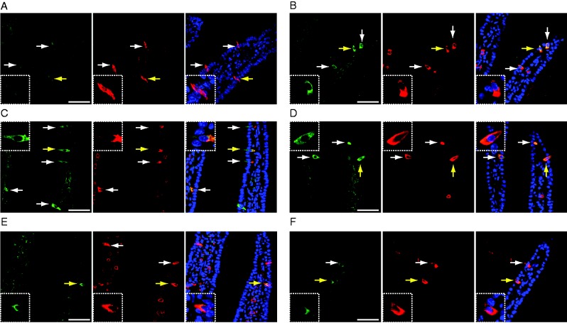 Figure 5. Activation of CaMK2 of duodenal enteroendocrine cells. (A, B, C, D, and E) Immunohistochemistry of phospho-CaMK2 (green) and 5-HT (red) of duodenum is shown. (A) Oral vehicle administration. (B) Intraduodenal glucose administration. (C) Oral maltose plus miglitol administration. (D) Oral miglitol administration. (E) Oral acarbose administration. (F) Intraperitoneal glucose administration. Insets denote the cells indicated by yellow arrows at a higher magnification. White arrows indicate immunopositive cells. (A, B, C, D, and E) Images of phospho-CaMK2 (left), 5-HT (middle), and their superposition (phospho-CaMK2, 5-HT, and DAPI). Bars indicate 50 μm.