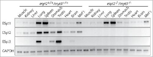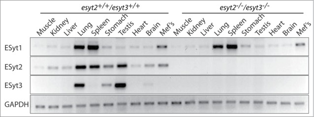 Figure 2. Expression of Esyt1, −2 and −3 mRNA in adult mouse tissues and MEFs. RT-PCR analyzes are shown for tissues from both wild type esyt2+/+/esyt3+/+ and esyt2−/−esyt3−/− mice as compared with GAPDH.