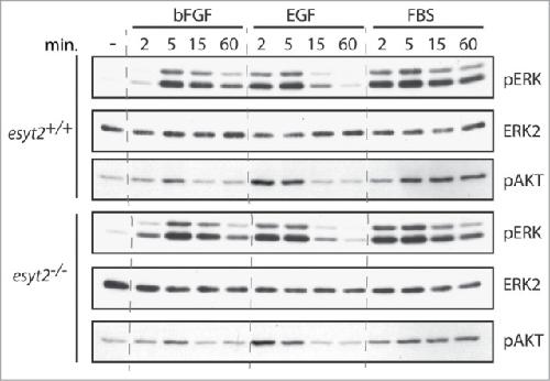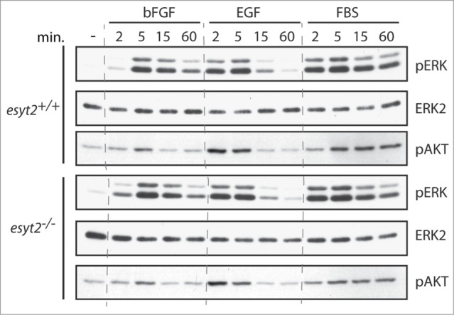 Figure 5. Response of ERK and AKT to extracellular stimulation in esyt2â/â MEFs. Esyt2+/+ and esyt2â/â MEFs were treated at 0Â min. with FGF, EGF and FBS and activation of ERK and AKT followed at the indicated times using phospho-specific antibodies (pERK (â1 and â2) and pAKT). ERK2 was detected using a specific antibody and was used as loading control.
