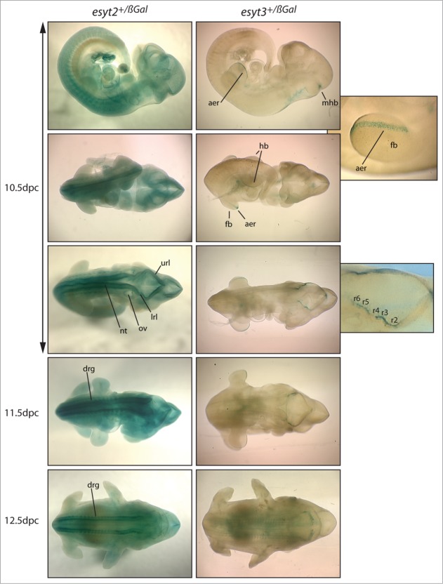 Figure 3. Expression pattern of the esyt2 and −3 genes in early mouse embryos. Expression was determined by conversion of X-Gal (blue-green) by ß-galactosidase produced from the gene inserted into the esyt2 and esyt3 gene loci. Enlarged panels on the right show a limb-bud and the hindbrain region of esyt3+/ß−Gal embryos. “aer” apical ectodermal ridge, “mhb” midbrain-hindbrain boundary, “fb” forelimb bud, “hb” hindlimb bud, “url” and “lrl” upper and lower rhombomere lips, “r2-6” rhombomeres, “ov” otic vesicle, “nt” neural tube, “drg” dorsal root ganglion.