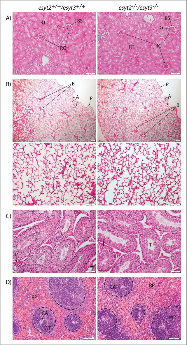 Figure 4. Representative Hematoxylin-Eosin staining of sections obtained from 2 11 month old esyt2−/−esyt3−/− sibling males and 2 11 month old esyt2+/+esyt3+/+ sibling males. Organs displayed were those that showed a strong or differential expression of ESyt1, 2 and 3, see Figure 2. (A) The renal cortex of WT and DKO mice are essentially indistinguishable. Renal tubules (RT) and renal corpuscles (RC) with glomeruli (G) and Bowman's space (BS) are indicated. Scale bars 100 μm. (B) Top panels: Lung sections with pleura (P), bronchioles (B) and alveoli (A) indicated, scale bars 200 μm. Bottom: higher magnification of alveoli, scale bars 100 μm. (C) Testis morphology also appears normal, seminiferous tubules (T) and the surrounding Leydig cells (L) are indicated, scale bars 100 μm. (D) White pulp (WP- encircled) with central arteries (CA) and red pulp (RP) of spleen samples are indicated, scale bars 100 μm.