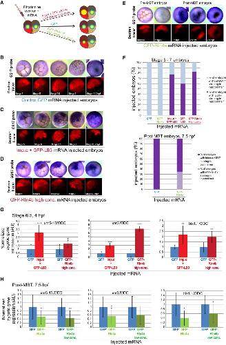 Figure 3. Altering the N/C Volume Ratio Changes the Timing of the Onset of Zygotic Transcription(A) The experimental scheme is depicted in which one blastomere of a two-cell embryo is coinjected with rhodamine-labeled dextran and mRNA to alter nuclear size in half of the embryo.(BâE) Embryos at the indicated stages and microinjected with the indicated mRNAs were subjected to in situ hybridization to detect the GS17 transcript. The top panels are bright-field images of embryos stained for GS17 (purple). The bottom panels are the corresponding rhodamine fluorescence images indicating cells in the embryo that received the indicated mRNA. Representative embryos are shown.(F) The top graph shows the percentage of stage 5â7 embryos in which the injected half showed GS17 staining whereas the uninjected half did not (dark purple bars). GFP: n = 57; GFP-Rtn4a: n = 42; Imp.α + GFP-LB3: n = 119; GFP-LB3: n = 124; GFP-Rtn4b high conc.: n = 139. The bottom graph shows the percentage of post-MBT (7.5 hpf) embryos in which the injected half showed weak GS17 staining relative to the uninjected half (light purple bar). GFP: n = 38; GFP-Rtn4a: n = 70.(G and H) One-cell embryos were microinjected with the indicated mRNAs to increase (G) or decrease (H) nuclear size and allowed to develop to stage 6.5 (G) or post-MBT 7.5 hpf (H). Total RNA was isolated from 12 embryos for each condition and converted to cDNA. Expression levels of three zygotic genes (xnr5-13, xnr3, and bix1.1) were determined by qPCR, normalized to ODC. Gene-expression levels are plotted in arbitrary units (AU) relative to GFP mRNA-injected control embryos. The means from two independent experiments are shown; error bars represent SD; âââp < 0.001; ââp < 0.01; âp < 0.05.See also Figure S3. |