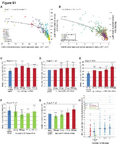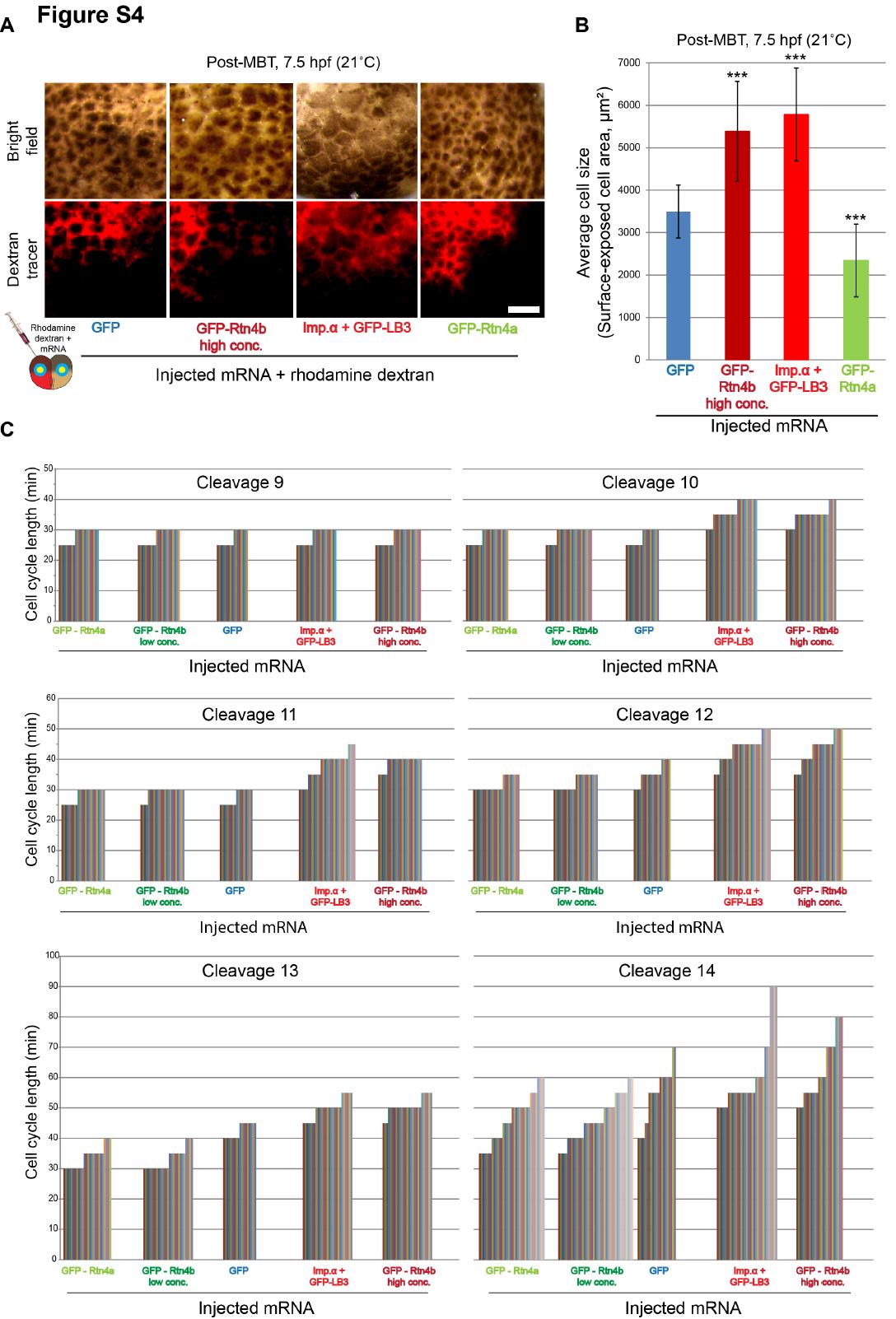 Figure S4, Related to Figure 4. Altering the N/C volume ratio changes the timing for the onset of longer cell cycles (A) One blastomere of a two-cell embryo was co-injected with rhodamine-labeled dextran and the indicated mRNAs to alter nuclear size in half of the embryo. At 7.5 hpf, bright field and rhodamine fluorescence imaging were performed on the animal pole. Compared to uninjected embryo halves, cells with increased nuclear size are larger due to premature slowing of cell cycle lengths, while cells with decreased nuclear size are smaller due to additional rapid cell divisions. The scale bar is 100 μm. (B) One-cell embryos were microinjected with the indicated mRNAs. Bright field images were acquired on the animal pole surface of late stage 8 (7.5 hpf) embryos. Cell sizes were estimated by quantifying the area of surface-exposed cells. Cells from at least four embryos were quantified for each condition. Total number of cells quantified: GFP, n=57; GFP-Rtn4b high conc., n=50; Imp.α + GFP-LB3, n=54; GFP-Rtn4a, n=66. Error bars represent SD, *** P<0.001. (C) Raw data used to generate Figure 4A are shown. One-cell embryos were microinjected with the indicated mRNAs. Bright field time-lapse imaging was performed on the animal pole at 5 min intervals. Cell cycle lengths were measured for at least four cells per embryo starting at the ninth cell division, for six embryos per condition. Each bar represents an individual cell. Data from two independent experiments are shown. |
