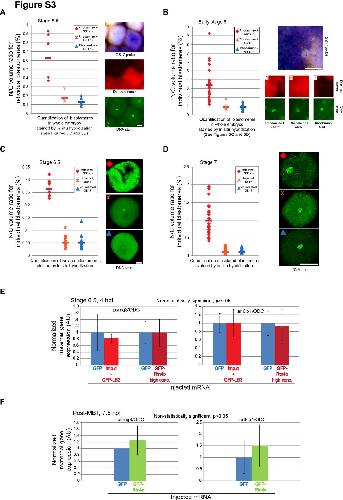 Figure S3, Related to Figure 3. Premature GS17 zygotic gene expression strongly correlates with increased N/C volume ratios, and altering the N/C volume ratio does not change maternal transcript expression levels determined by qPCR (A,B) One blastomere of a two-cell embryo was co-injected with rhodamine-labeled dextran and mRNA to increase nuclear size (either Imp.α + GFP-LB3 or GFP-Rtn4b high concentration) in half of the embryo. Embryos were allowed to develop to stage 6.5 (A) or early stage 8 (B) and stained for GS17 by whole mount in situ hybridization (see Figure 3A-D). Nuclei were visualized with Sytox Green, and cell and nuclear crosssectional areas were measured. N/C volume ratios were extrapolated from these measurements for cells that received the mRNA and stained for GS17 (rhodamine+ GS17+), cells that received the mRNA and showed weak or absent GS17 staining (rhodamine+ GS17-), and cells that did not receive the mRNA and did not stain for GS17 (rhodamine- GS17-). Numbers of stage 6.5 blastomeres analyzed were: rhodamine+ GS17+, n=6; rhodamine+ GS17-, n=5; rhodamine- GS17-, n=12. Numbers of early stage 8 blastomeres analyzed were: rhodamine+ GS17+, n=28; rhodamine+ GS17-, n=13; rhodamine- GS17-, n=20. Mean values are indicated by thick horizontal lines. Scale bars, 50 μm. (C,D) One-cell embryos were microinjected with mRNA (GFP-Rtn4b high concentration) to increase nuclear size. Blastomeres were isolated from injected and un-injected embryos at stages 6.5 and 7 and stained for GS17 by whole mount in situ hybridization. Nuclei were visualized with Sytox Green, and cell and nuclear cross-sectional areas were measured. From these data, N/C volume ratios were calculated for blastomeres from injected embryos that stained for GS17 (injected, GS17+), blastomeres from injected embryos that did not stain for GS17 (injected, GS17-), and blastomeres from un-injected embryos that did not stain for GS17 (un-injected, GS17-). Numbers of stage 6.5 isolated blastomeres analyzed were: injected, GS17+, n=7; injected, GS17-, n=13; un-injected, GS17-, n=15. Numbers of stage 7 isolated blastomeres analyzed were: injected, GS17+, n=25; injected, GS17-, n=36; un-injected, GS17-, n=16. Mean values are indicated by thick horizontal lines. Scale bars, 50 μm. (E,F) One-cell embryos were microinjected with the indicated mRNAs to increase (E) or decrease (F) nuclear size and allowed to develop to stage 6.5 (E) or late stage 8 (F). Total RNA was isolated from 12 embryos for each condition and converted to cDNA. Expression levels of two maternal genes (psmg3 and arl6ip1) were determined by qPCR, normalized to ODC. Gene expression levels are plotted in arbitrary units (AU) relative to GFP mRNA injected control embryos. The means from two independent experiments are shown, error bars represent SD, and all differences are not statistically significant compared to the GFP controls (P>0.05). |