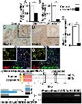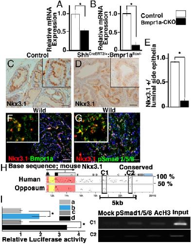 Figure 5. Decreased expression of Nkx3.1 in the Bmpr1a-CKO mutants. A and B, Nkx3.1 expression decreased in mutant prostate at P1 (A) and in the mutant AP at P28 (B). The relative mRNA equivalents for each sample were normalized by the RNA levels for ribosomal protein L8. Bars represent the mean ± SE of triplicate assays of RNA from pooled tissues (A) and 6 tissue samples (B). Statistical significance was indicated by asterisks (*, P < .05). C, Nkx3.1 was detected in the luminal epithelia of the control AP at P28. D, Significantly reduced levels of Nkx3.1 protein were detected in the mutant AP. E, The ratios of Nkx3.1-positive cells were shown in the graph. F, Colocalization of Nkx3.1 and Bmpr1a in the AP luminal epithelia of adult mice. G, Colocalization of pSmad1/5/8 and Nkx3.1 in the AP luminal epithelia of adult mice. F and G, Cryosections were used. Scale bars, 20 μm. H, Genomic sequences of the mouse Nkx3.1 aligned with its orthologous loci in human and opossum. The sequence alignment was performed using MultiPipMaker. A noncoding region conserved from human to opossum was indicated with black boxes in the C1 and C2 regions. The black arrow indicated exons of mouse Nkx3.1. Coding and untranslated sequences were shaded with red and yellow, respectively. A 5-kb (5399 base) region in the 3â²-genomic region of Nkx3.1 contained a candidate enhancer region for the mouse prostate. The scale at the bottom of the alignment indicated relative positions in the mouse Nkx3.1 locus. I, The candidate 5-kb prostatic regulatory enhancer activated expression of a luciferase reporter in response to Smad1/4 expression (by 6 independent assays). It also responded to the addition of Bmp7 (by 3 independent assays) (means ± SE) (*, P < .05). a, Control. b, Transfected with Smad1/4 gene. c, Control. d, Transfected with Smad1/4 gene + addition of Bmp7. J, ChIP/PCR assay on bladder neck of ICR mice including prostate region at P2 showed pSmad1/5/8 binding to regions of C1 and C2 in the 3â²-region of mouse Nkx3.1. Both regions were enriched in chromatin immunoprecipitated with antiacetylated histone H3 as a positive control. |